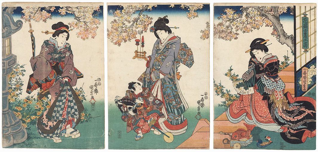 Comments - Charming scene of a young boy riding a hobby horse as three beauties smile delightedly as they watch him play. The woman in the center hold a small rack with miniature processional standards, and a fish on wheels and other toys rest on the floor at lower right. The woman above wears a black outer kimono with a fantastic pattern of a feather robe, a reference to a popular Noh play about a tennin or heavenly Buddhist spirit whose feather robe is found by a fisherman. Blossoming cherry trees frame the sky above, with a stone lantern and flowering yellow roses at left. A lovely design with sweetly expressive figures.
