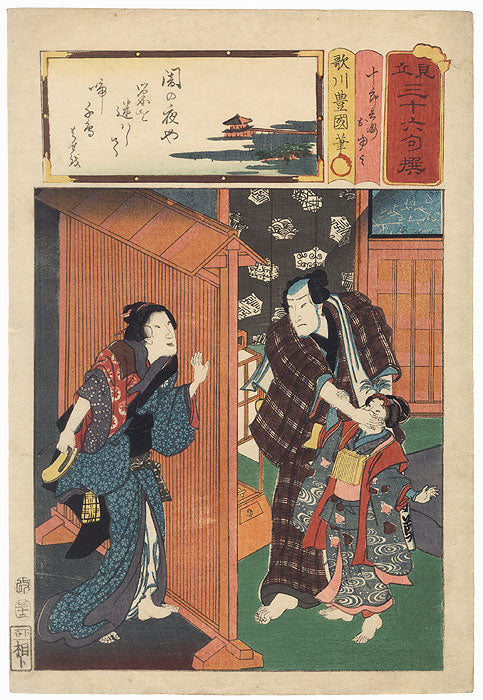 Ichikawa Ichizo III as Jurobei and Onoe Kikujiro II as Oyumi, 1857 - Poignant kabuki image from the tale of Oyumi and Jurobei. Oyumi and her husband, the samurai Jurobei, had left their infant daughter in her grandparent's care while Jurobei attempted to recover a lost sword for his master, joining a gang of thieves to have access to places where the blade might be hidden. One day, Oyumi met a young girl who was on a pilgrimage to find her parents, and to her surprise, discovered she was her long-lost daughter. Sadly, she cannot reveal her true identity, wanting to protect the child from her husband's criminal activities. Here Oyumi stands outside the door, smiling eagerly and carrying a sandal. Jurobei waits inside, placing his hand over the girl's mouth to keep her quiet. The child wears a red pilgrim's vest over her kimono, and has a string of votive plaques around her neck. The actors are Onoe Kikujiro II as Oyumi and Ichikawa Ichizo III as Jurobei. A moving scene with a nicely detailed setting.