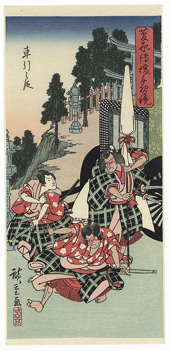 Comments - Wonderful kabuki scene of actors as travelers seeking shelter from the rain under the spreading branches of a tree. The design is loosely based on a similar genre scene by the artist Hanabusa Itcho, who died in 1724. Two religious pilgrims crouch at left, a string of prayer slips tied around their necks. Behind them a man peers out from underneath a lion dance costume. In the center a monkey trainer squats with his animal perched on his back. A musician stands behind him resting a shamisen over his shoulder as a samurai in a black robe runs up from the right. Three of the actors are Otani Hiroemon V, Matsumoto Kinsho I, Iwai Kumesaburo III. A fantastic look at the various classes of old Edo brought together for a moment during a rainstorm. The Boston Museum of Fine Arts has this image in its collection.