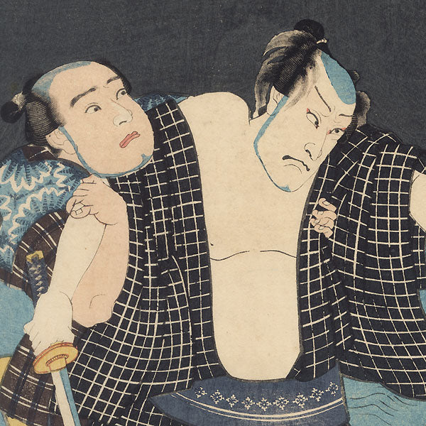 Comments - Dramatic kabuki scene of a boatman trying to restrain a commoner brandishing a sword. The boatman grabs him from behind, pulling him off balance, an alarmed expression on his face as the commoner scowls angrily. The commoner's kimono hangs open at the chest, and his hair is disheveled. Undulating waves can be seen behind the grassy embankment beneath the night sky. Nice expressive figures in a handsome natural setting. Detailed with embossing on the white loincloth.