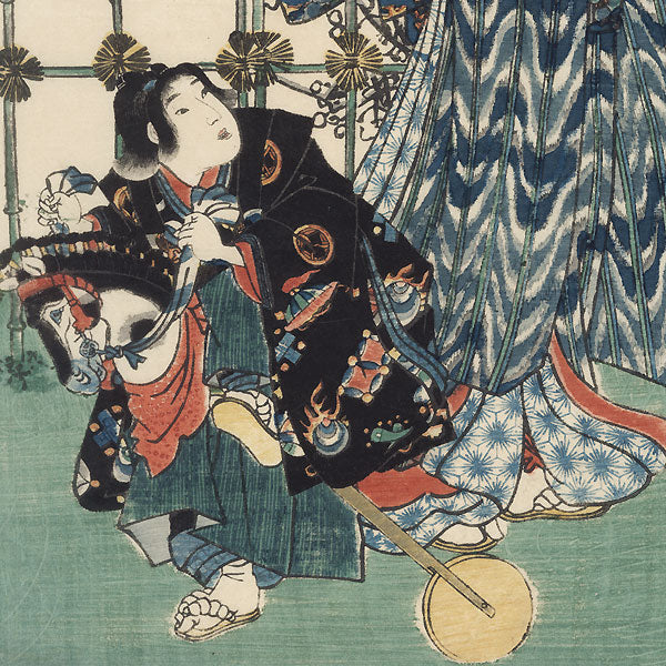 Comments - Lovely triptych illustrating a scene from the first month of the year. Three beauties and a young boy are gathered in a garden beneath ancient plum trees covered with white buds and blossoms. The child rides a toy hobby horse, smiling back over his shoulder as he grips the striped reins. The elegantly dressed beauty at right can't help smiling at his enthusiasm, hiding her mouth behind her kimono sleeve as she giggles. Her robe is patterned with chrysanthemum blossoms, the flowing sleeves trimmed with tasseled bows. Her hair is adorned with clusters of blue flowers and hairpins with dangling bells. The woman in the center claps her hands with delight, while the beauty at left carries the young prince's sword upright. She wears a gray-green kimono with a design of gourds and vines, tied with a dragon obi. The Boston Museum of Fine Arts has this image in its collection. A charming design, beautifully detailed.