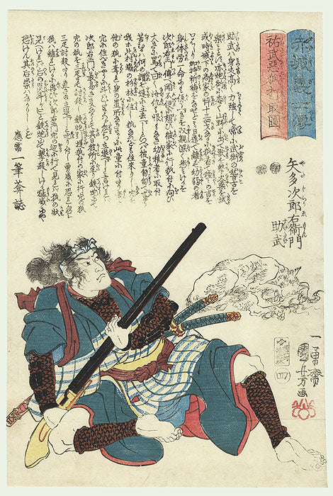 Yoshikane Displays his Courage in the Red Temple, circa 1848 - Dramatic portrait of Oboshi Rikiya Yoshikane, the young son of the 47 ronin's leader Oboshi Yuranosuke, just before committing seppuku in the Kwagakuji Temple. He leans back on one knee with a gun in hand, a fierce expression on his face. The sleeves of his green kimono are tied back with a sash, and his hair sticks out wildly around his face. Curiously, a white dog lies on the floor behind him, covering its face with one paw, the other holding hanks of hair. A great image from this rarely seen Kuniyoshi ronin series.